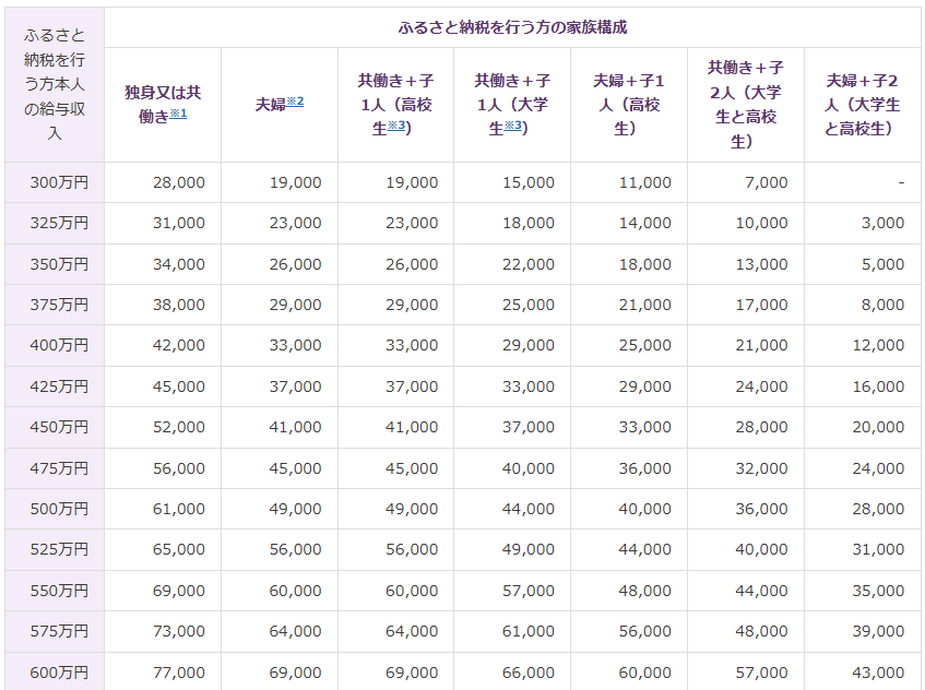 | ふるさと納税者の給与収入 | 独身または共働き | 夫婦 | 共働き + 子一人(高校生) |