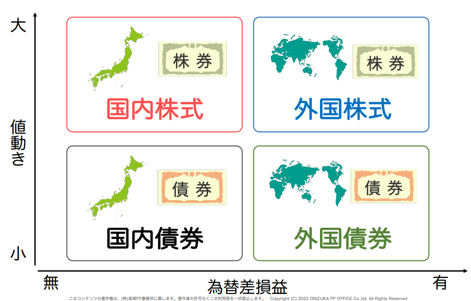 投資初心者が資産形成で安定を目指すなら、4つの資産に分散して投資する方法が効果的です。具体的には、以下の4つの資産クラスそれぞれに投資することで、景気変動や地域の経済状況が資産全体に与える影響を抑えられます。