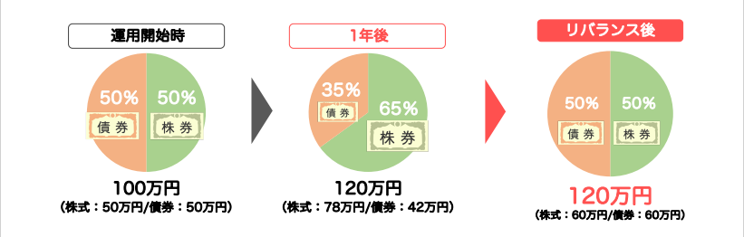 時間の経過や市場の値動きによって崩れた資産配分の比率を、当初決めた目標の割合へ戻す作業のこと。