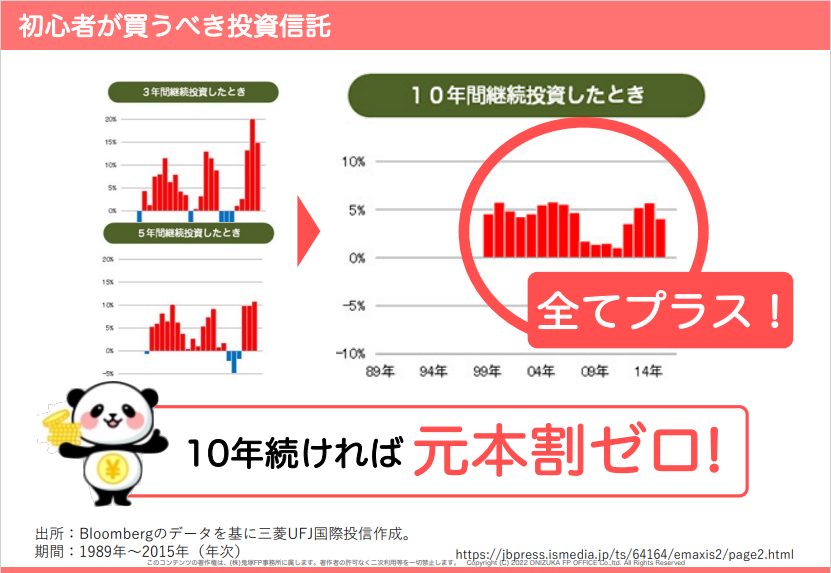株式が不調でも債券や不動産が資産を支えてくれる仕組みです。分散投資を10年間継続できれば、元本割れをするケースはゼロになるというデータもあります。