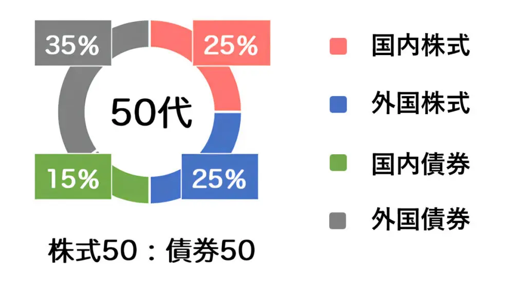 では、50代の場合どのようなバランスで分散すればよいのでしょうか。5刷累計1万9,000部を突破したベストセラー書籍「50歳ですが、いまさらNISA始めてもいいですか?」では、50代向けの配分例として以下の比率をおすすめしています。