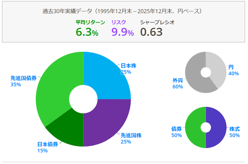 この配分で過去30年間の運用実績を見ると、年平均リターンは約6.3%となり、安定性と収益性のバランスがとれた構成といえます。