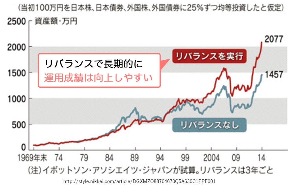このリバランスは単にバランスを戻すだけでなく、利益を押し上げる効果も期待できます。実際、リバランスを実施した場合としなかった場合で約600万円もの差が出たというデータもあります。