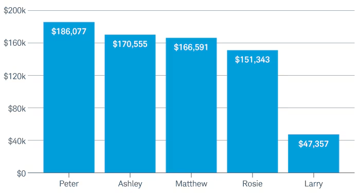 意外なことに、20年間にわたって毎年投資した5人のうち、最も成績が悪かったのは投資しなかったラリー(Larry)でした。一方、毎年その年の最高値で買ってしまった最も不運なロージー(Rosie)でさえ、投資しなかったラリー(Larry)より大幅に資産を増やしています。