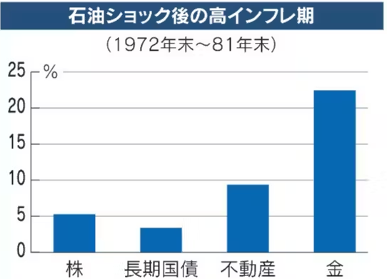 まず、ゴールドはインフレに強いという特徴があります。インフレとは物価が上がってお金の価値が下がることですが、ゴールドの価値は物価と連動して上昇する傾向があります。実際、1970年代のインフレ時には米国株式が5%程度のリターンに対し、ゴールドは20%以上のリターンを上げました。