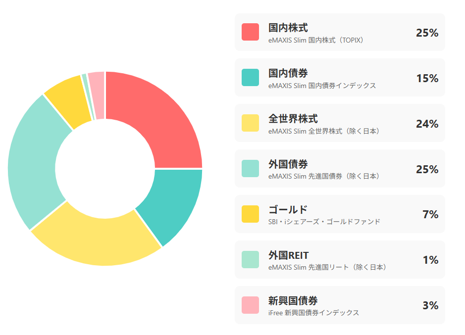 国内株式と国内債券の配分は、初級・中級と同じです。先進国株式は単独ではなく、新興国株式も含めた全世界株式(eMAXIS Slim全世界株式)で24%とします。先進国債券は中級編よりもさらに減らして25%としました。ゴールドは、中級編と同じく7%を維持しています。
