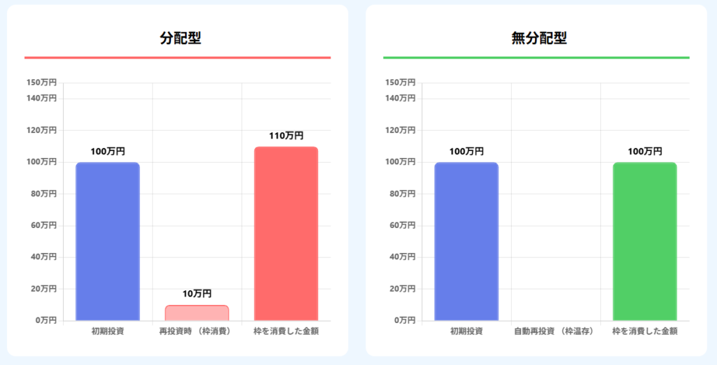 たとえば、100万円投資して10万円の分配金が出た場合、それを再投資すると合計110万円分の枠を消費することになります。一方、無分配型なら100万円投資後、ファンド内で10万円が自動で再投資されても、非課税枠の消費は100万円のままです。