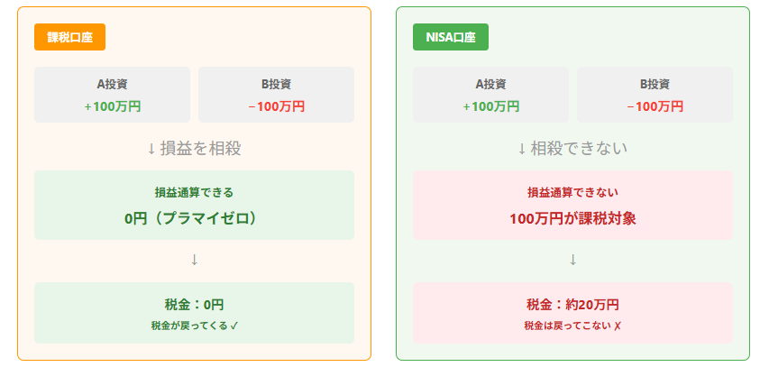 たとえば、NISA口座ではない税金がかかる口座なら利益100万円と損失100万円が相殺されてプラマイゼロになり、税金が戻ってきます。しかし、NISAで損失が出た場合、この損失をほかの口座の利益と相殺できないため、税金は戻ってきません。