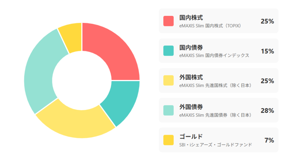 国内株式と国内債券・外国株式の配分は初級編と同じで、変わるのは外国債券とゴールドの部分です。先進国債券を初級編の35%から28%に減らし、その7%分をゴールドに回しています。