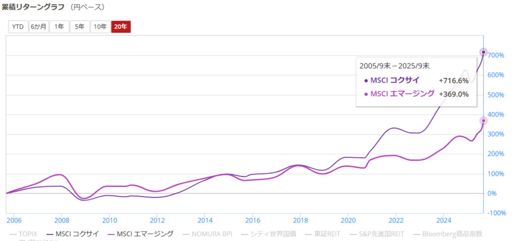 ただし、直近20年のパフォーマンスを見ると、新興国株式は先進国株式に負けているという現実があります。先進国株式が+716%のリターンであったのに対し、新興国は+369%と先進国株式を下回る結果でした。